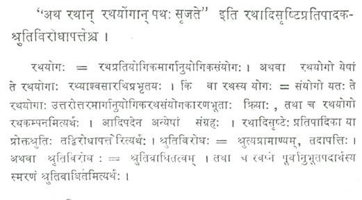 It is in relevance to chariot and the contact of the wheel the quote explains dream state, when a perceived thought on Chariot, is not a recollection, ‘It is seen as a chariot’. In addition, it would violate the scriptural statements that establish the creation of the objects such as chariot in a dream. (Sanskrit text quote “na tatra ratha na rathayoga na panthano bhavanti, atha rathan rathayoga pathassrijate” ). (Brihatharanyakam.Up.IV-3-10). Initially (in the dream state), there are neither chariots, nor the horses to pull those chariots nor the roads for them to traverse. Therefore the chariots, horses and roads are created (in the dream). The chariot experienced in a dream is a projection of the mind. They remain real for the perceiver as long as the dream or the projection lasts. Generally, these projections are negated by the subsequent knowledge arising from further perception. In the case of dream objects, the objects may exist as long as the dream lasts.